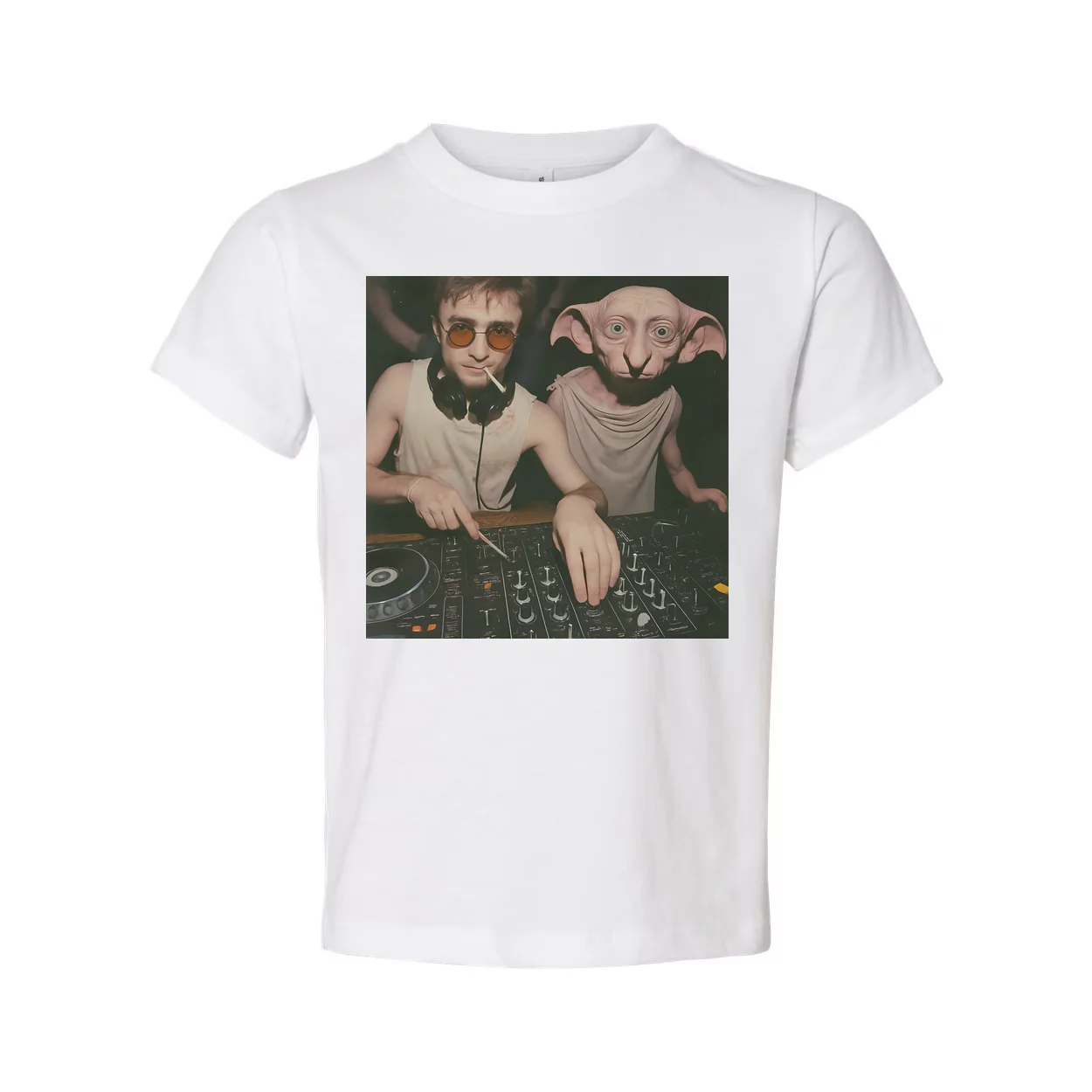 - Bold center-front print featuring a Dobby-inspired elf alongside a DJ setup, bringing a fun crossover of magic and music.