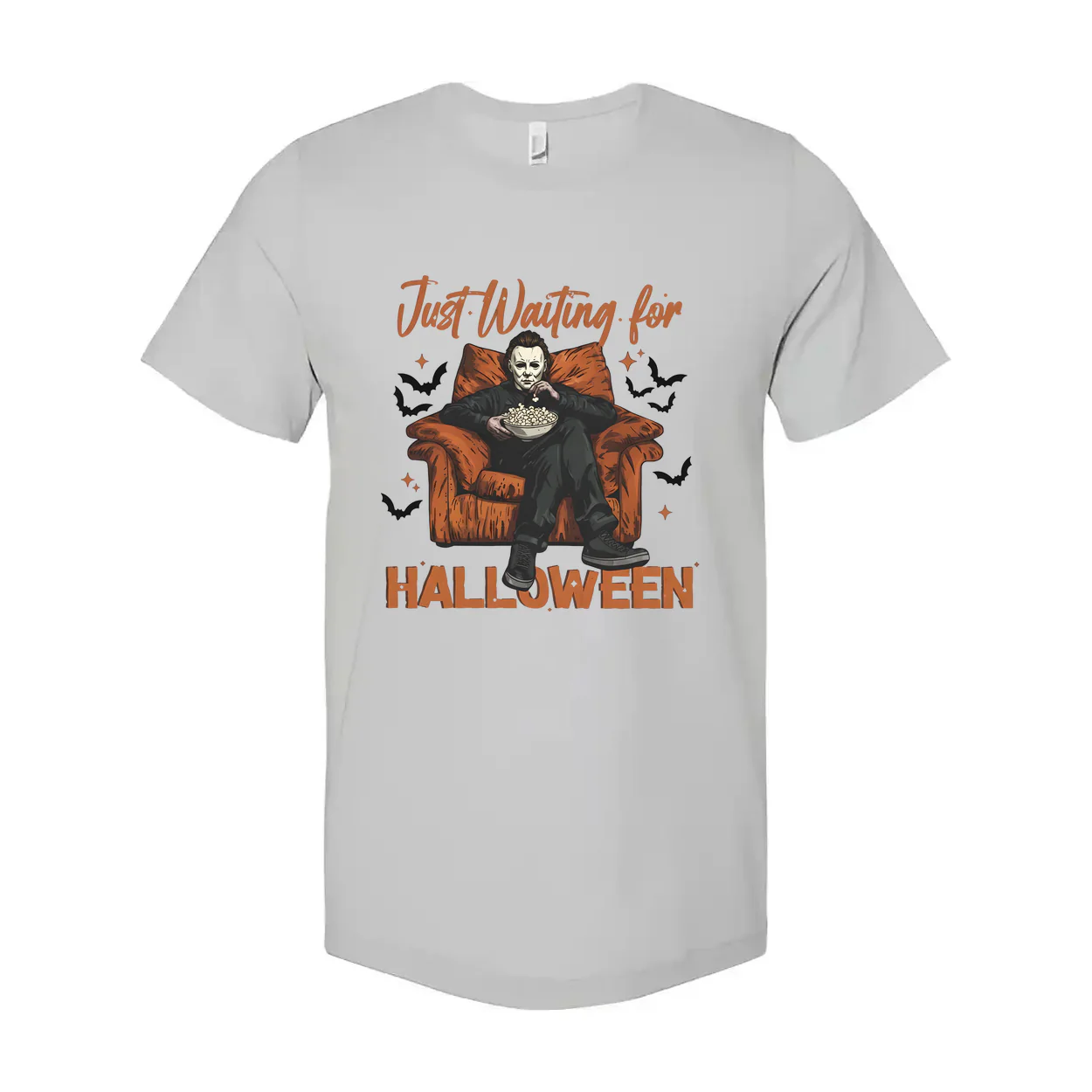 Capture the fun and anticipation of Halloween with this Just Waiting For Halloween unisex graphic tee. A bold illustration on a white shirt shows a character lounging in a plush orange armchair, popcorn in hand, as bats swoop around—perfect for fans of spooky humor and seasonal style.