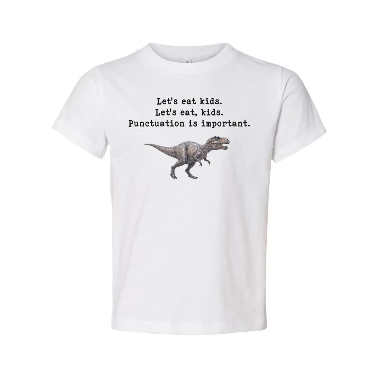 Make punctuation fun and comfortable with the Lets Eat Kids Punctuation Is Important Unisex T Shirt. This playful tee celebrates the power of punctuation with a nod to the classic joke, reminding everyone that proper punctuation matters with a touch of whimsy—a friendly dinosaur illustration sits beneath the bold typography on a classic white tee.