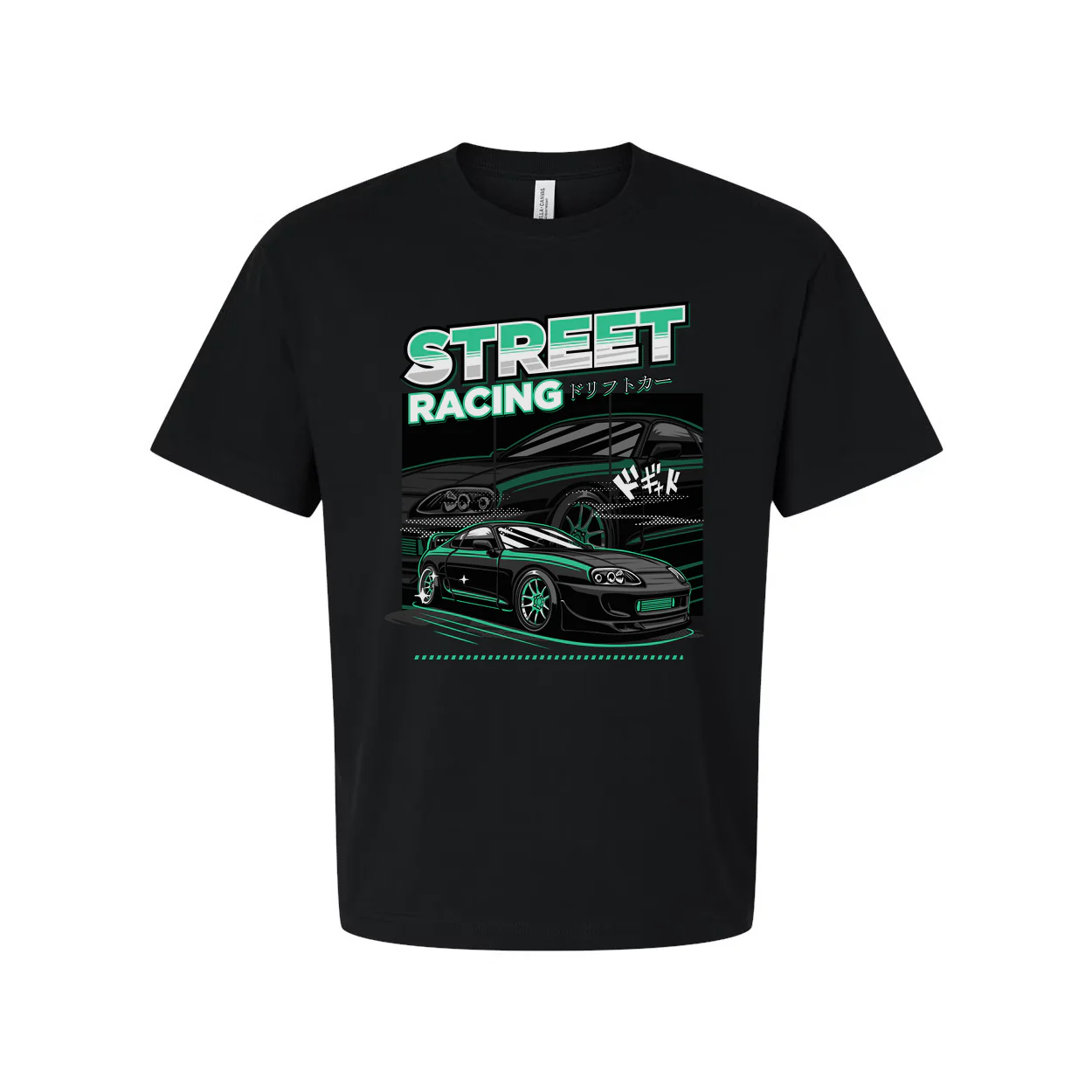 - Bold, multi-panel graphic featuring a tuned Toyota Supra in a teal-and-black colorway that captures street-racing energy.