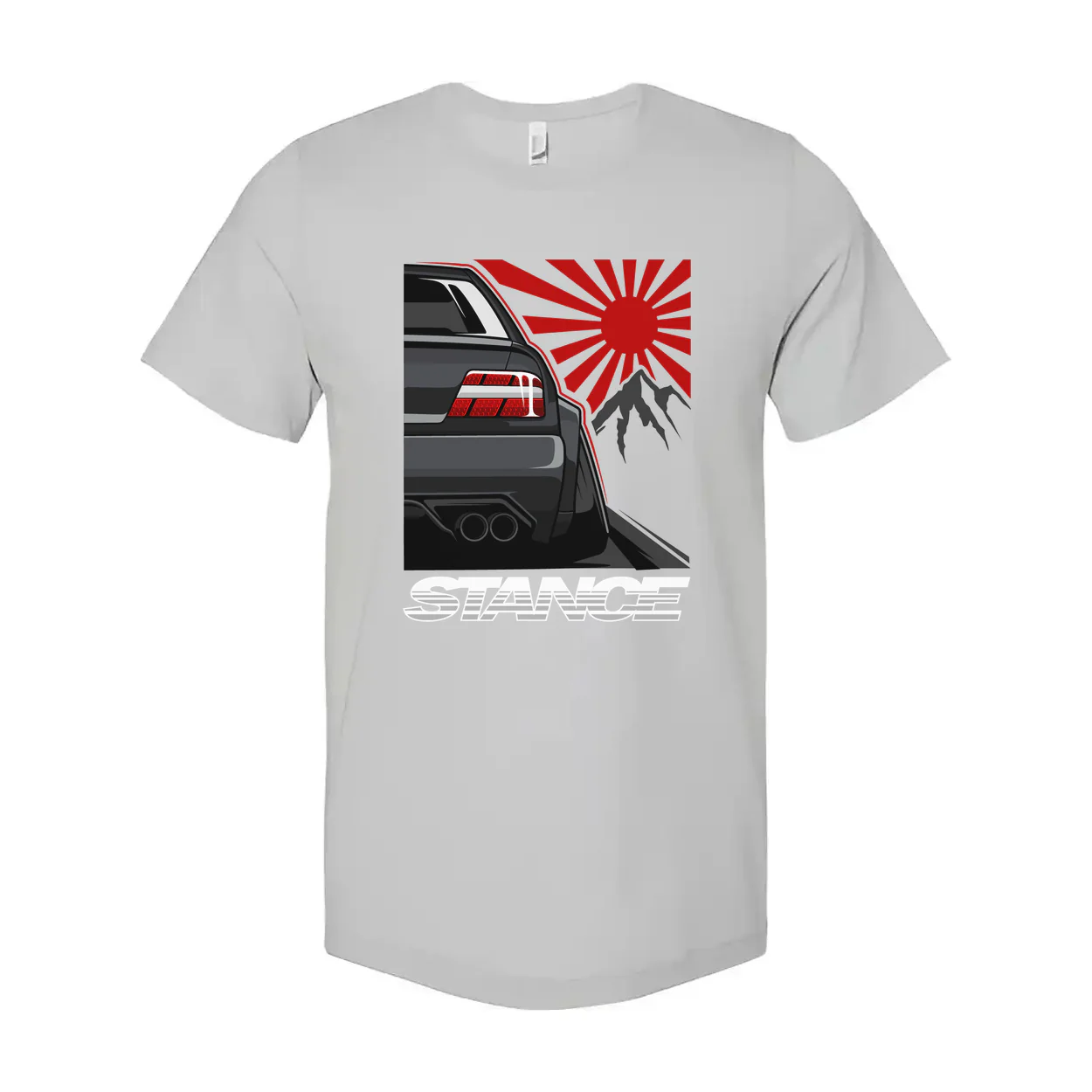 - Graphic print featuring the rear view of a tuned car with a bold red sunburst and mountain motif