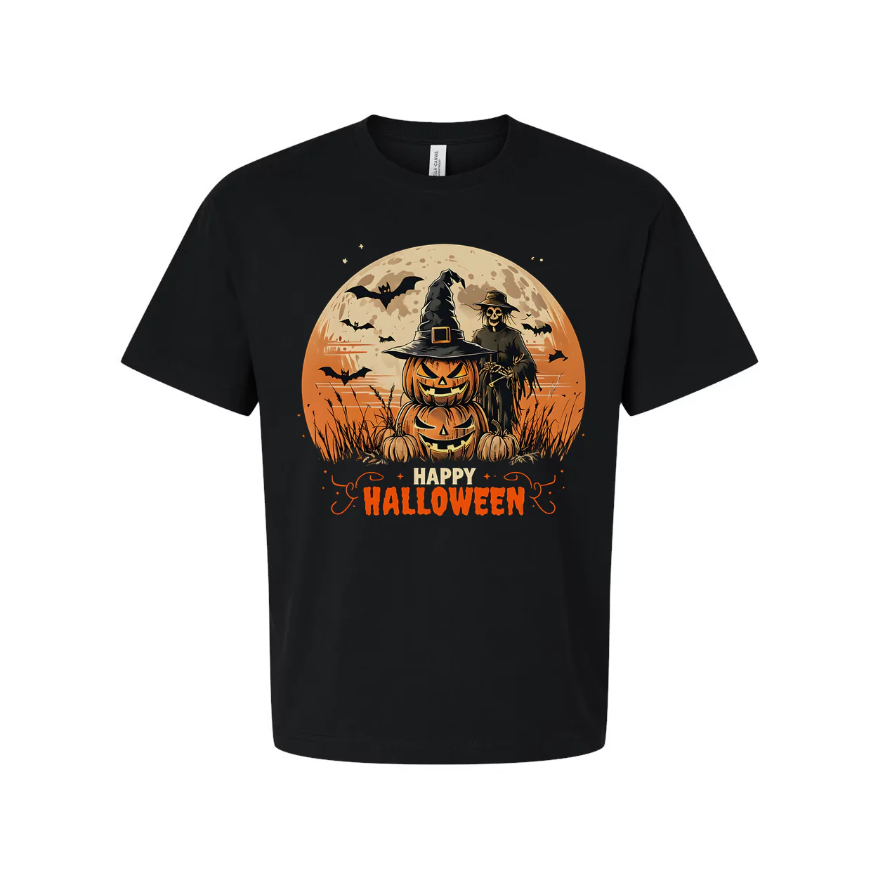 The centerpiece is a warm orange sunset scene featuring stacked jack-o-lanterns wearing a witch’s hat, a friendly scarecrow, bats in flight, and tall grasses against a full moon. The bold, vintage-inspired illustration brings classic Halloween charm to casual wear, and the unisex fit makes it easy to pair with jeans, jackets, or layers for fall fashion.