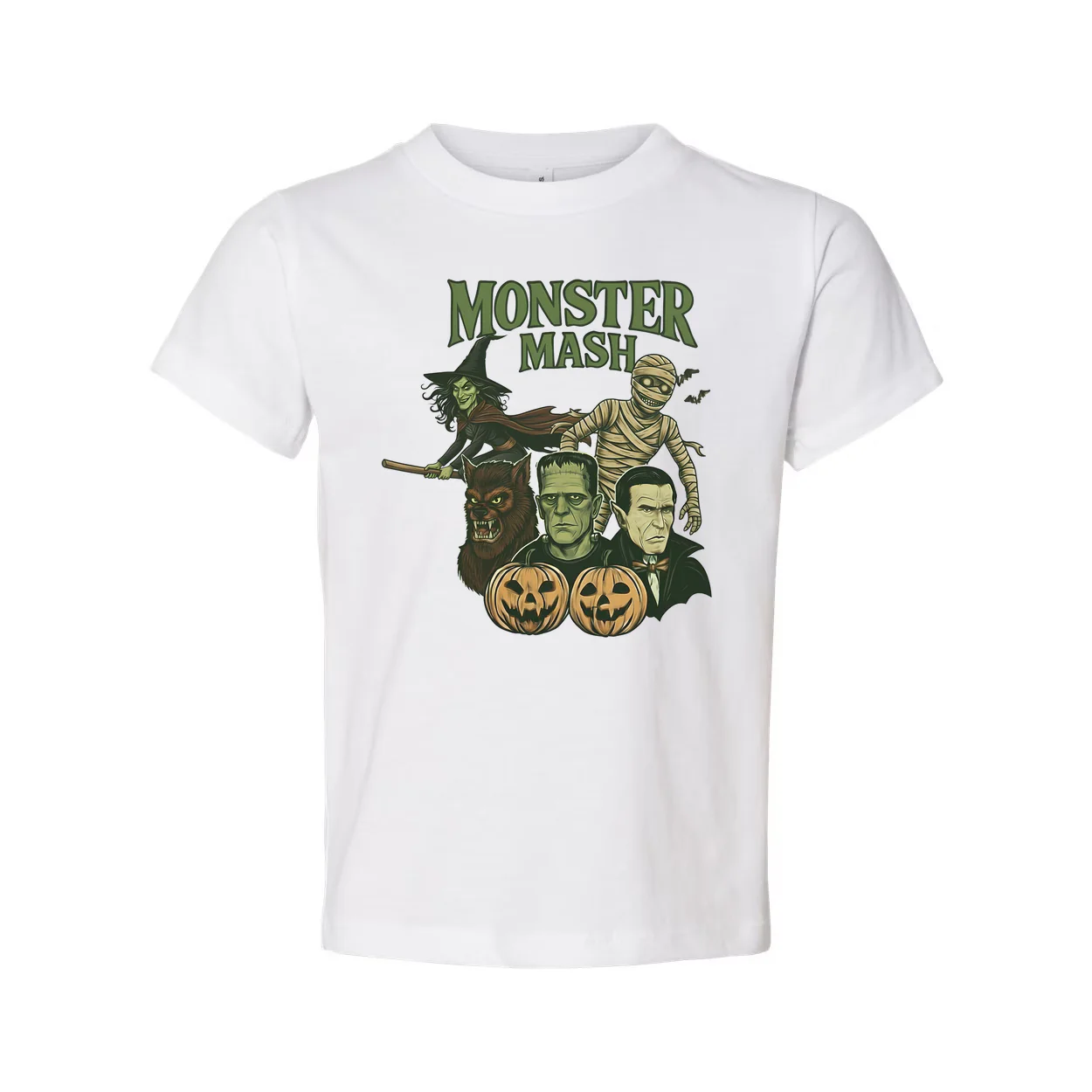 - Graphic tee with a retro Monster Mash design that features a witch, mummy, werewolf, Frankenstein-like figure, vampire, and carved pumpkins in vintage hues.
