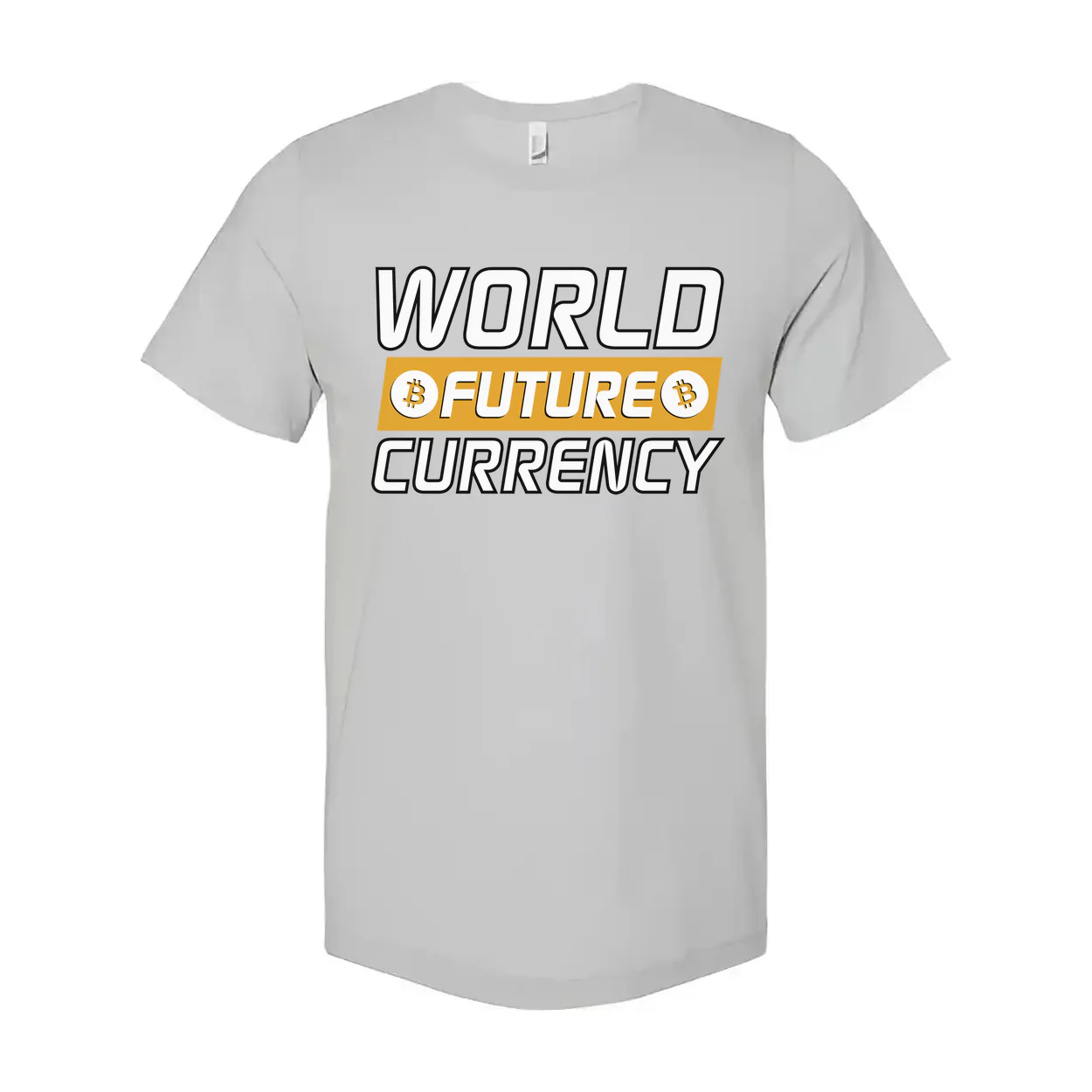 - Graphic front features WORLD FUTURE CURRENCY with a gold-toned stripe and Bitcoin symbols on each side